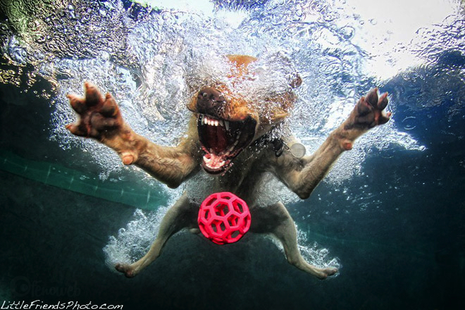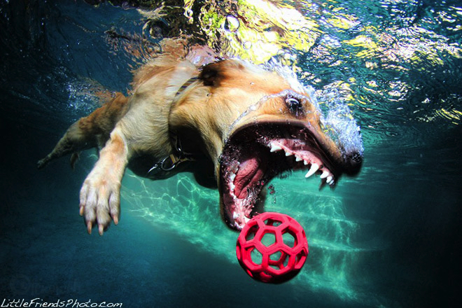 Seth Casteel est un photographe américain passionné par la photo sous-marine. Étant aussi passionné par la race canine, il a décidé de jumeler ses deux passions, pour photographier des chiens dans l'eau. Il trouve que les images montrent un aspect différent des chiens. Sa technique est simple, il jette une balle dans l'eau, et attend le moment opportun pour prendre les photos une fois que le chien vient récupérer sa balle. Des photos magnifiques qui donnent un aspect féroce à certains chiens. Pour voir plus de clichés de Seth Casteel voici son facebook, et son site web.