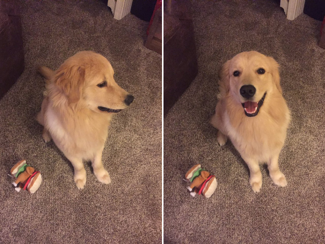Si le titre de cet article vous fait vous poser des questions, il s'agit tout simplement d'une galerie de photos de chiens prit avant de leur dire que ce sont des bons chiens, et après leur avoir dit. Les photos montrent que les chiens réagissent instantanément aux félicitations de leur maître. "Ohhh ça c'est un bon chien ça" et le visage du toutou s'illumine. Des images mignonnes qui vos donneront peut-être envie d'essayer avec votre compagnon canin. Vous pouvez toujours tenter d'essayer avec votre chat mais là je vous certifie bien moins de résultats. Découvrez la réaction des chiens après les félicitations de leur maîtres.