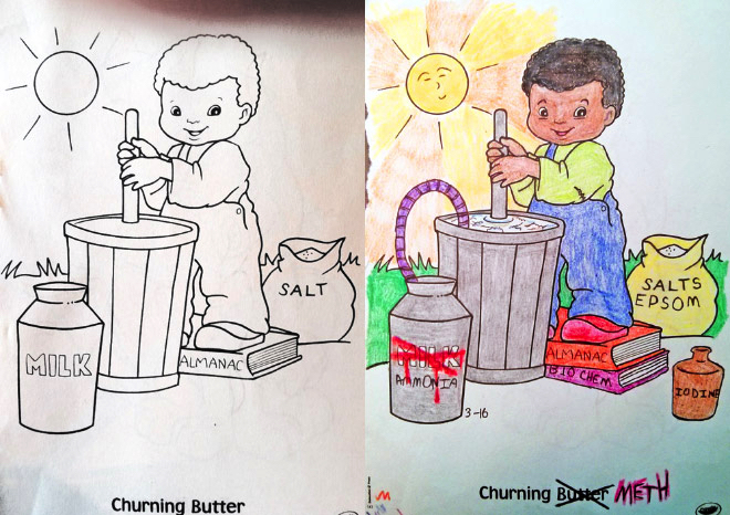 Prenez un cahier de coloriages pour enfants tout à fait banal. Ajoutez-y beaucoup d'imagination et un bon coup de crayon pour le détourner de la façon la plus trash qui soit, et vous obtiendrez un cahier de coloriages déconseillé aux moins de 18 ans. Des détournements hilarants de dessins enfantins à la sauce gore. Quand le talent macabre d'un dessinateur s'invite dans un cahier de coloriages pour enfants, un gentil petit nounours peut se transformer en tueur d'escargot, ou de mignons petits chiots peuvent devenir de vrais drogués.