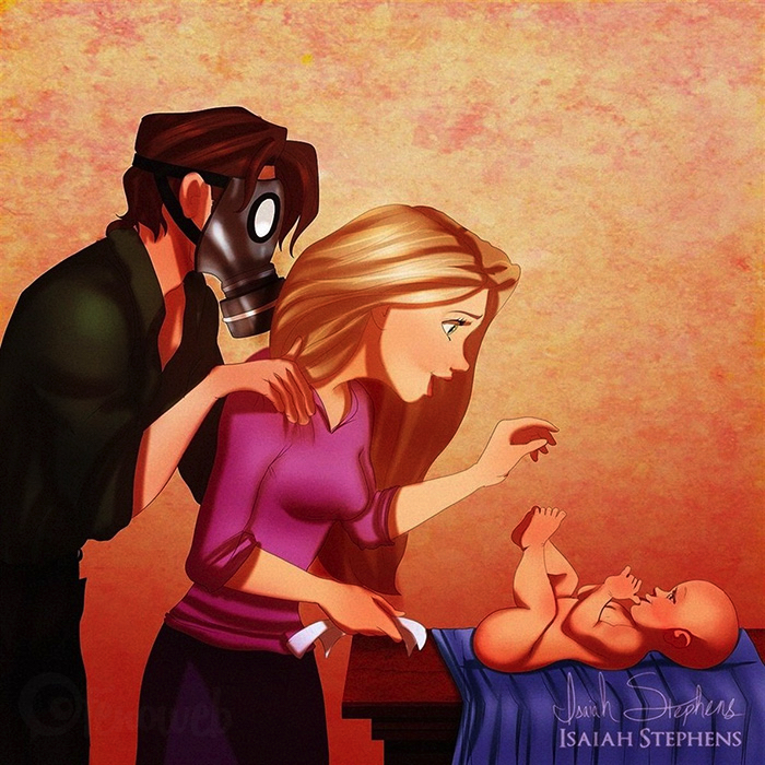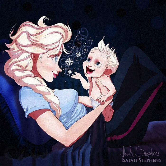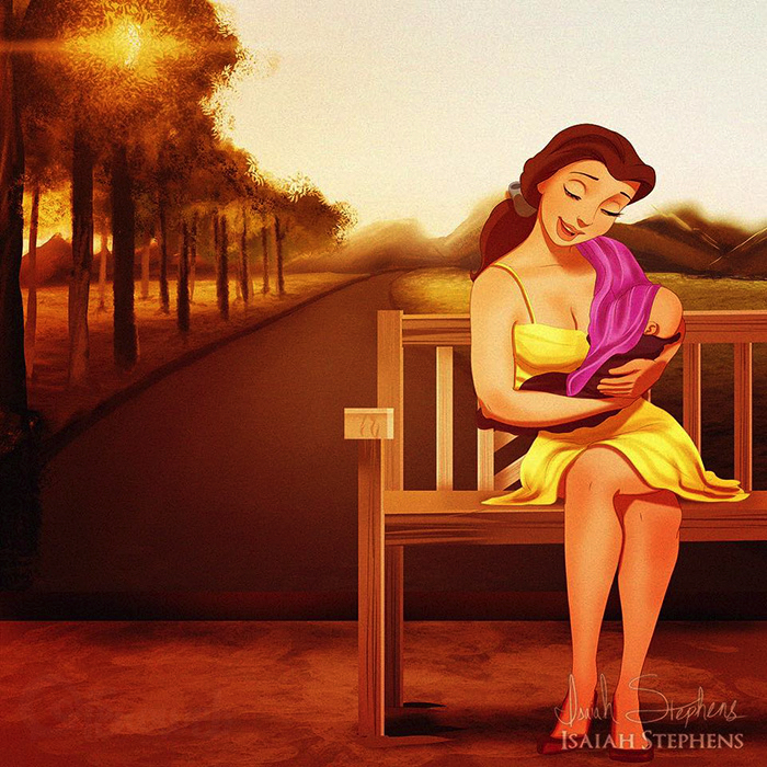 Les histoires Disney racontent bien souvent les romances d'une princesse et d'un prince, pour la plupart conclus par le fameux : "ils vécurent heureux et eurent beaucoup d'enfants", qui laisse libre cours à votre imagination pour rêver sur la suite de cette union idyllique. Mais voilà qu'une artiste s'est amusée à dessiner les princes et princesses Disney après la fin du dessin animé, une fois que les protagonistes se connaissent suffisamment pour envisager l'avenir avec des enfants par exemple. Du coup, elle a imaginé les princesses Disney enceinte ou tout simplement mit en scène le quotidien des princesses Disney si elles étaient mamans. À quoi ressemble la vie des princesses Disney dans une parfaite petite vie de famille ? Des dessins pleins de tendresse réalisés par Isaiah Stephens qui vous permet d'imaginer la suite des choses après le conte de féés.