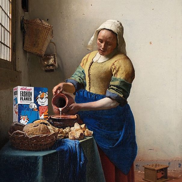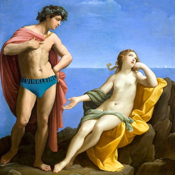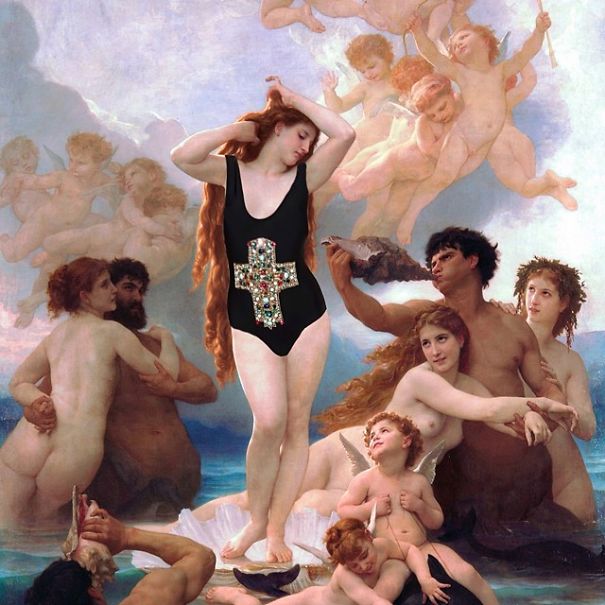Le classicisme est un mouvement culturel, esthétique et artistique qui se développe en France de 1660 à 1715. Il se définit par un ensemble de valeurs et de critères qui dessinent un idéal s'incarnant dans l’« honnête homme » et qui développent une esthétique fondée sur une recherche de la perfection. Des corps harmonieusement dessiné, une recherche du parfait à chaque coups de pinceaux... et pourtant, faut toujours qu'il y ai un pro Photoshop qui passe par ici. Cet artiste a décidé d'ajouter à chacune de ces peintures des accessoires de mode, s'impliquant dans le mouvement fashion, que ce soit des boucles d'oreilles Coco Chanel, des sacs de prêt-à-porter, ou encore des slips Calvin Klein. Réussi.