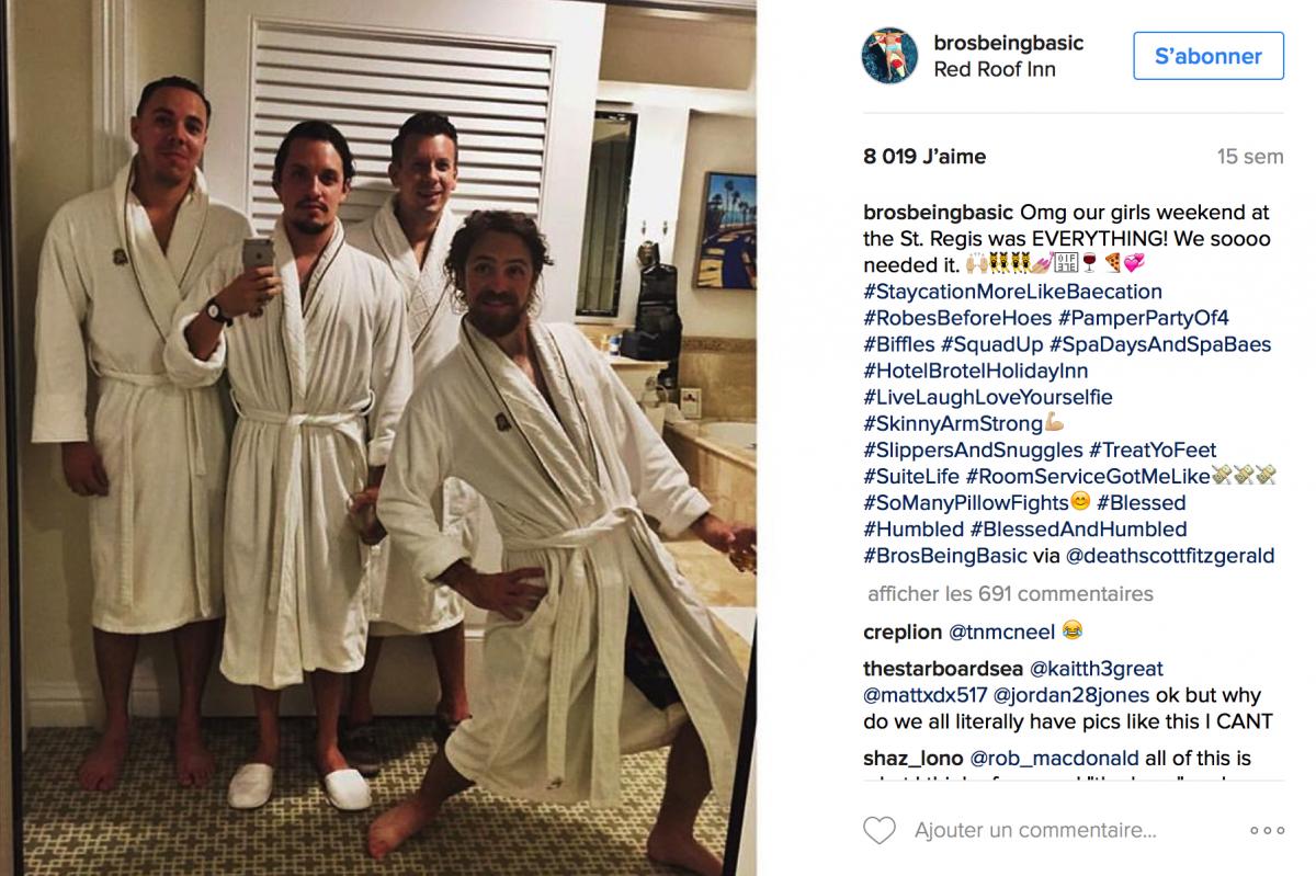 Manque de second degré s'abstenir ... Il n'est pas rare de trouver des similitudes entre les posts des femmes sur leurs comptes Instagram. Coffret beauté, jolie demoiselle fraiche au réveil en train de siroter un thé dans les draps blancs du lit de l'hôtel, petit saut en maillot de bain sur la plage, brochette de filles alignées sur des serviettes de plage. Quand serait-il si les hommes se mettaient à poster le même style de photo que les femmes ? Une parodie qu'une bande de joyeux luron sous le nom de "brosbeingbasic" s'est amusé à réaliser pour se moquer des photos des femmes bien trop présentent, et sans grandes originalitées sur les réseaux Instagram. Voici une sélection des meilleurs parodies de photos si les hommes publiaient les mêmes photos Instagram que les femmes.