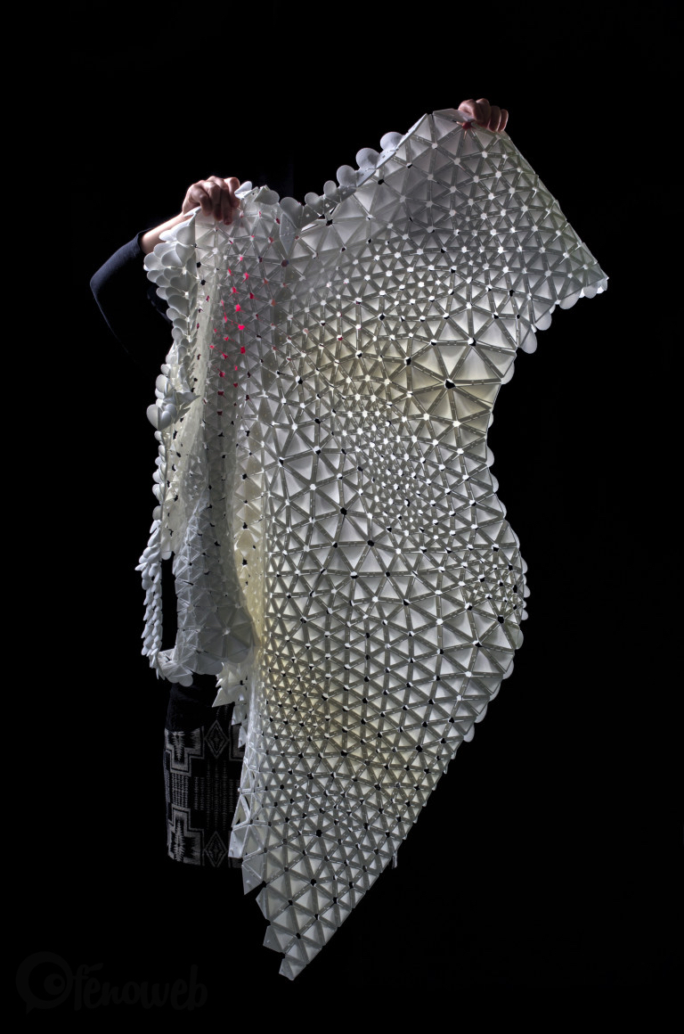 Kinematic petals dress est une robe entièrement fabriqué à l’aide d’une imprimante 3D, et inspiré par la nature. Elle explore la synergie entre la mode et la technologie. Inspiré de pétales, de plumes et d’écailles. Les éléments sont imbriqués ensemble, et articulés comme des sortes de coquilles.